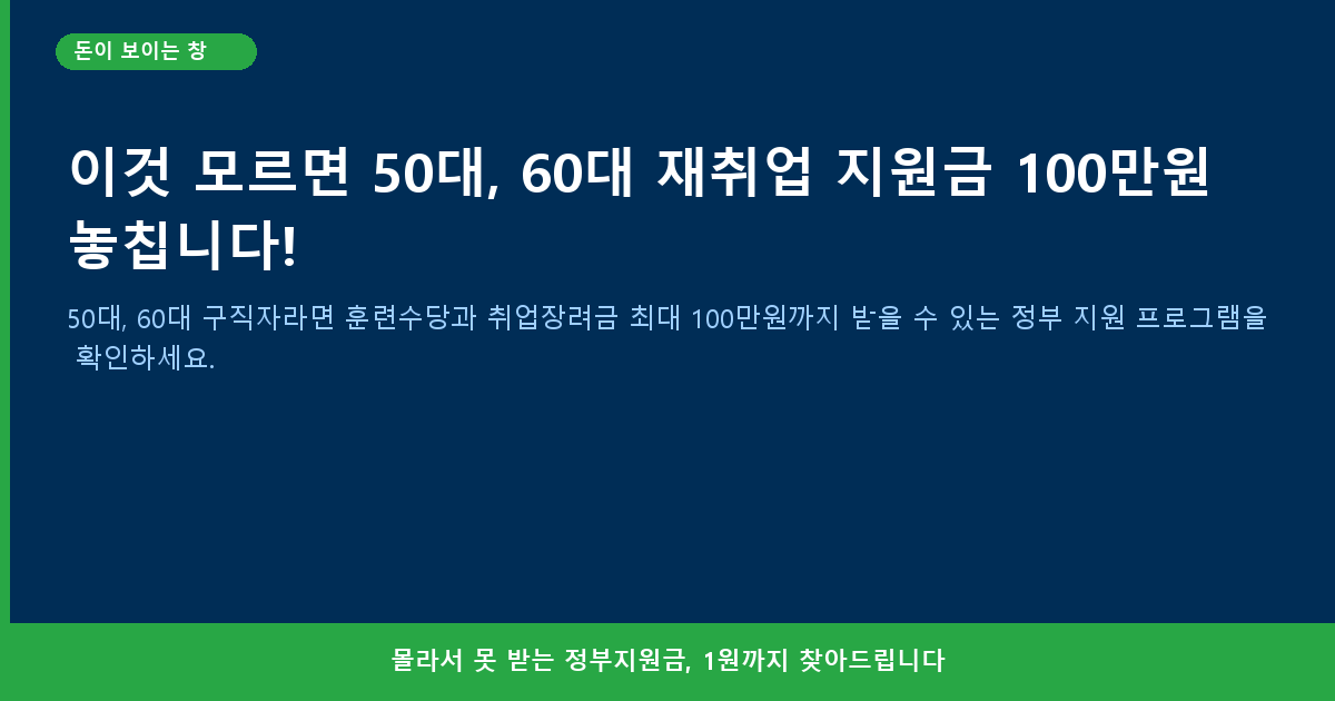 안녕하세요, 돈이 보이는 창 블로그 이웃님들! 오늘은 정말 좋은 소식, 아니 ‘초대박’ 소식을 들고 왔어요. “은퇴 후 다시 일할 수 있을까?” “경력단절된 내가 다시 직장을 찾을 수 있을까?” 이런 고민 많으셨죠? 걱정 마세요. 정부에서 50대, 60대 분들의 재취업을 든든하게 지원하는 새로운 프로그램을 내놓았거든요. 이전보다 훨씬 실질적인 도움을 받을 수 있어서 벌써부터 입소문이 자자해요. 오늘은 이 프로그램이 무엇인지, 누가 어떻게 신청할 수 있는지 제가 쉽고 자세하게 알려드릴게요!