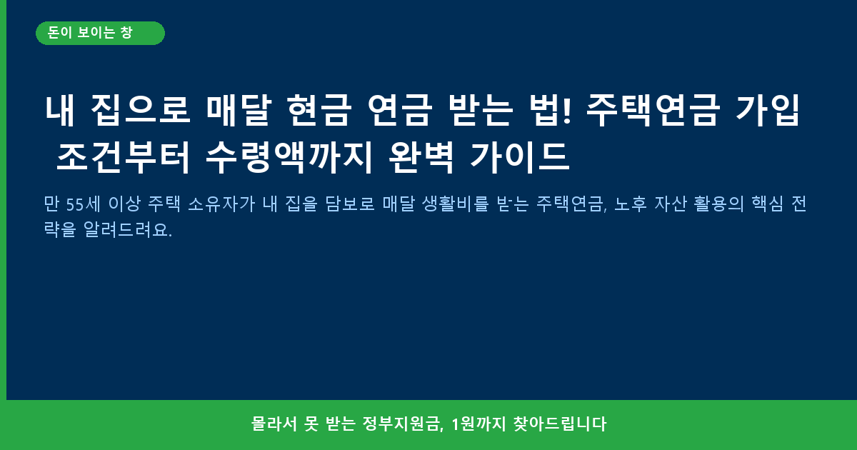 안녕하세요! ‘돈이 보이는 창’ 블로그 지기입니다. 은퇴 후에도 맘 편히 내 집에서 살고 싶지만, 고정 수입은 줄어들고 생활비는 만만치 않으시다고요? 이런 고민을 해결해 줄 든든한 대안, 바로 ‘주택연금’입니다. 주택연금은 만 55세 이상 주택 소유자가 본인 소유의 주택을 담보로 맡기고, 사망 시까지 매월 연금 방식으로 노후 생활자금을 받는 국가 보증 역모기지 제도예요. 국가가 보증하기 때문에 금융 기관의 파산 위험 없이 안정적으로 연금을 수령할 수 있다는 점이 가장 큰 장점이죠. 말 그대로 ‘내 집’이 ‘나만의 연금 통장’이 되는 셈인데요, 저는 이 제도를 알게 되고 나서 많은 분들이 노후를 더욱 풍요롭게 계획할 수 있겠다는 확신이 들었습니다. 주택연금에 대해 저와 함께 자세히 파헤쳐 보실까요?